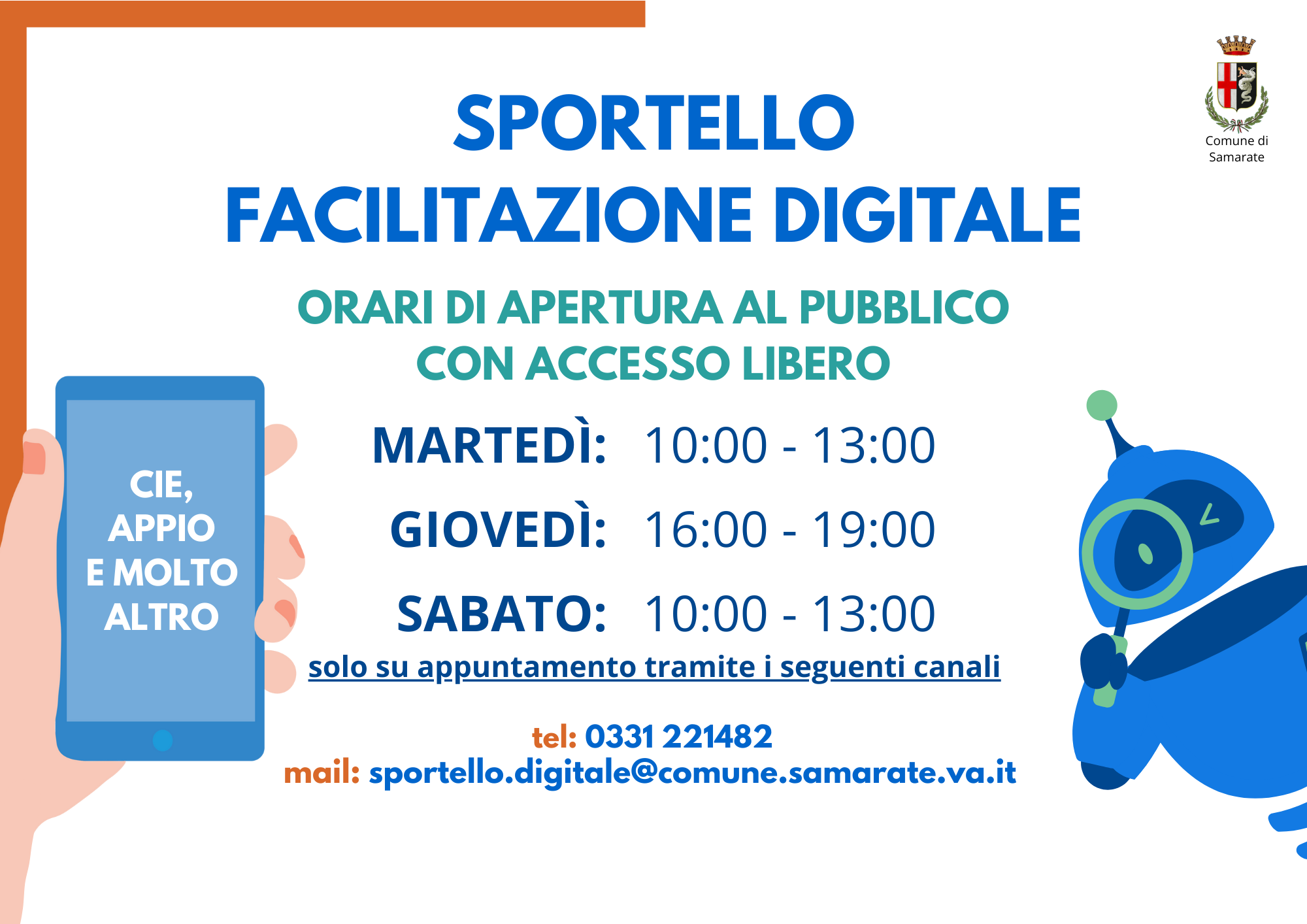 Si comunica alla cittadinanza l’aggiornamento degli orari di apertura al pubblico dello Sportello Digitale, in vigore a partire da gennaio 2026, come di seguito indicato: