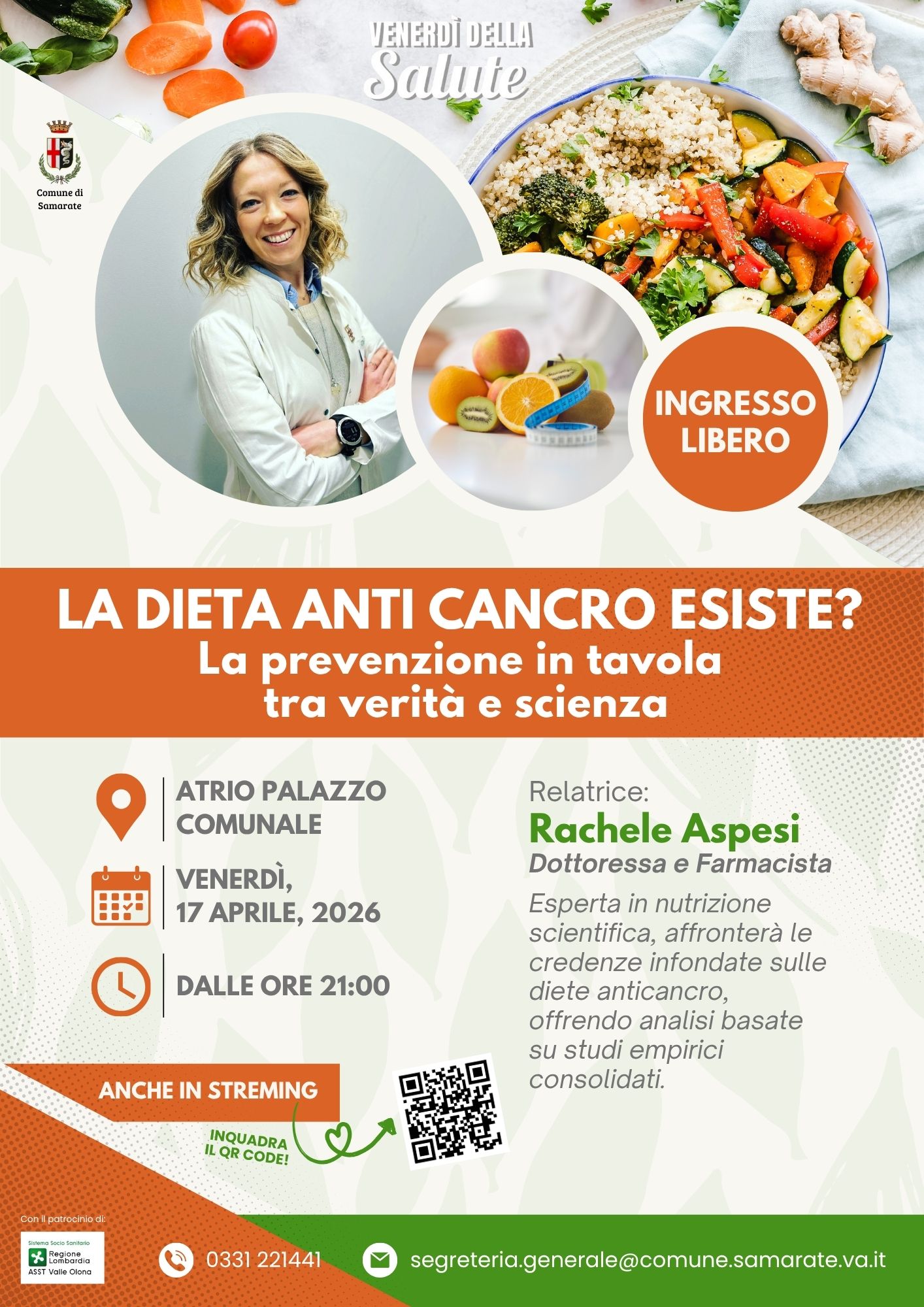Venerdì 17 aprile 2026, alle ore 21:00, l’atrio del Palazzo Comunale ospiterà un incontro aperto al pubblico dedicato a un tema di grande attualità: il rapporto tra alimentazione e prevenzione oncologica.